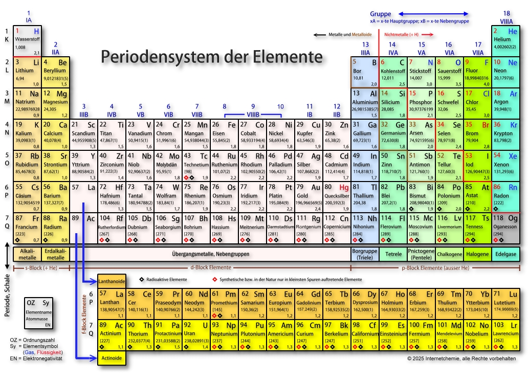 Die Periodennummer (1 bis 7) gibt die Anzahl der Elektronenschalen an, die das Atom im Bohr’schen Schalenmodell besitzt.